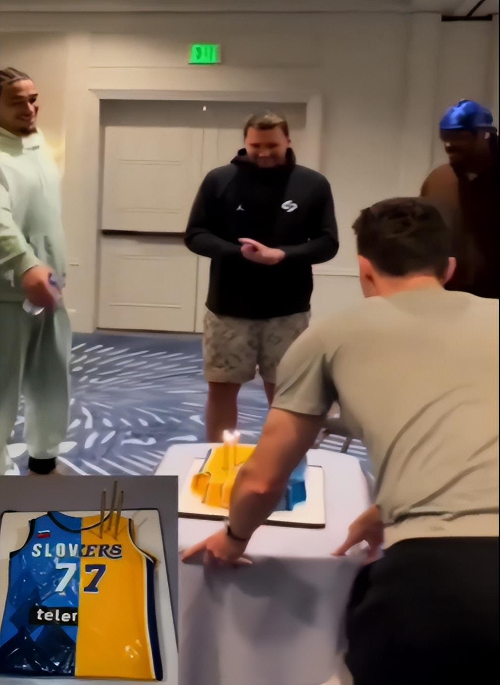 派对上有超大蛋糕、舞者,大家还为东契奇唱生日歌,他随后吹灭了蜡烛。